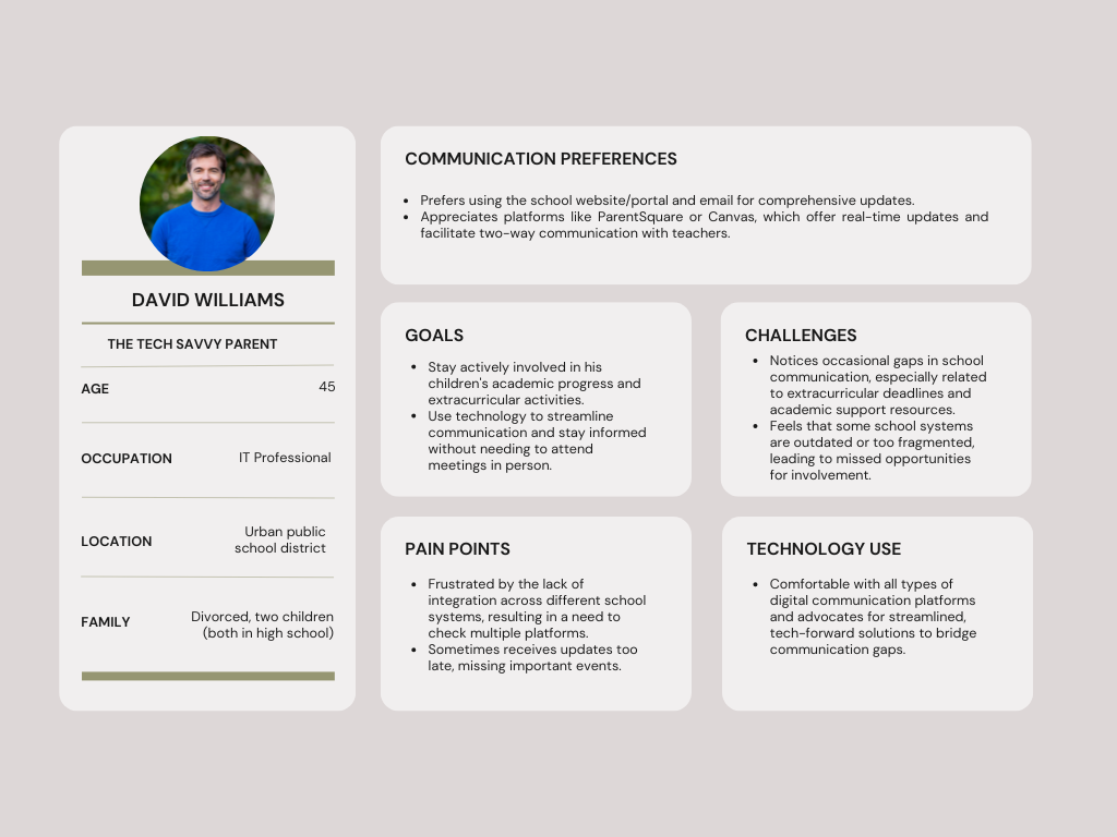 Parents often find it challenging to stay informed about their child's academic progress, attendance, and school activities through various communication channels and platforms. This is a problem because it can lead to gaps in communication, lack of engagement, and difficulty supporting their child's education.