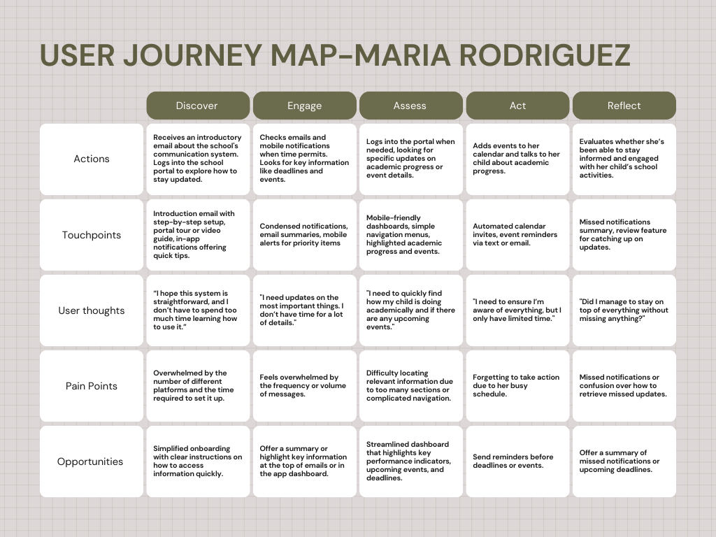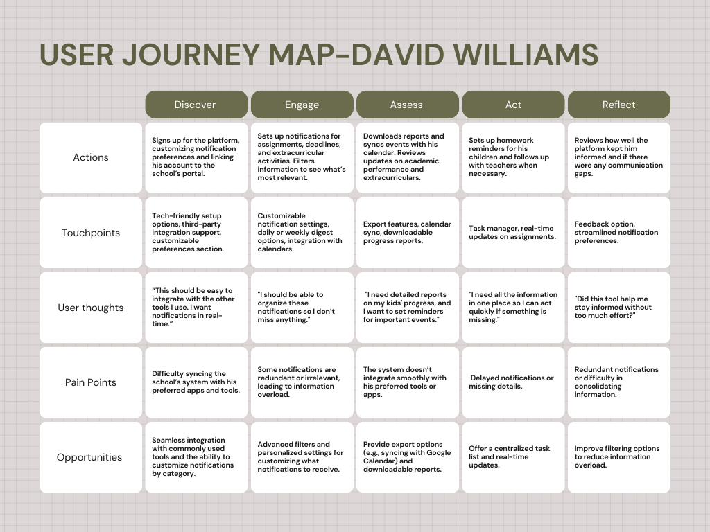 The solution is a digital ecosystem that centralizes school–home communication in one flexible, easy-to-use environment for busy K–12 parents. It streamlines setup with user profiles and customizable preferences, then delivers real-time updates on assignments, event reminders, and missed-notification summaries, and automated calendar invites to reduce communication gaps.